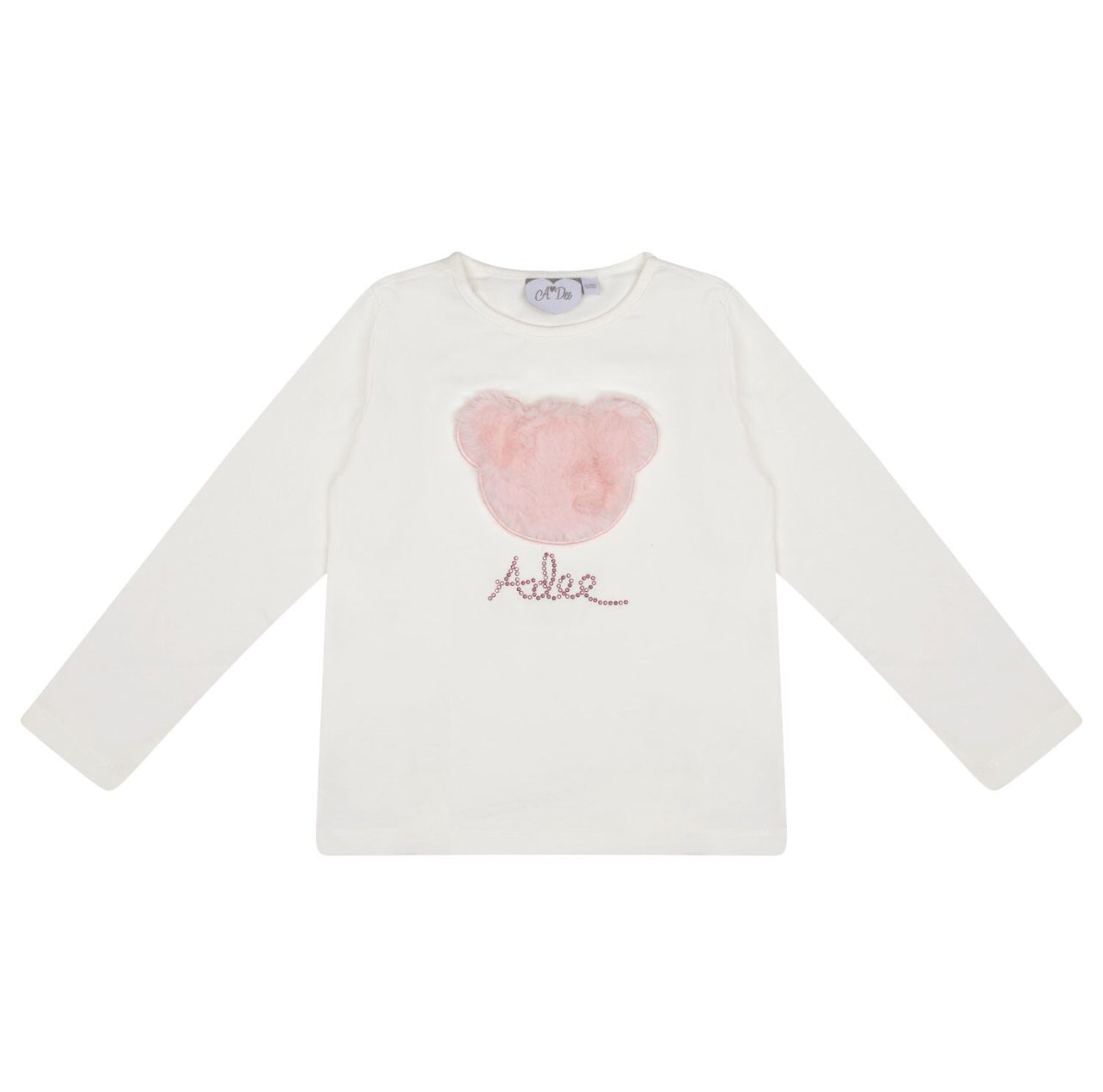 Faux fur A-line skirt set. Long sleeve jersey top featuring fur applique teddy head and diamanté branding on front.