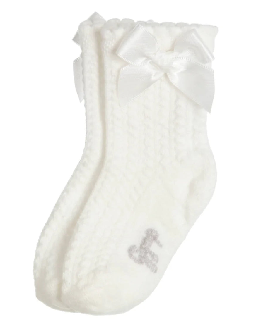 Always a perfect match ! Short socks in GYMP pastel colours, with knitted-in double cable pattern, wavy top and big fancy satin bows.