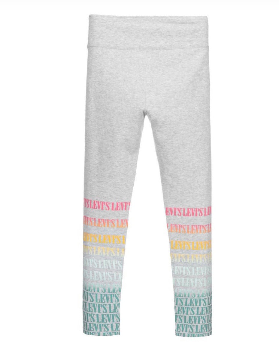 Teen girls grey long leggings with a colourful striped logo print on the legs. They are made in soft and stretchy cotton jersey. The fit is super-skinny, with a high rise waist and a logo printed near the waistband.