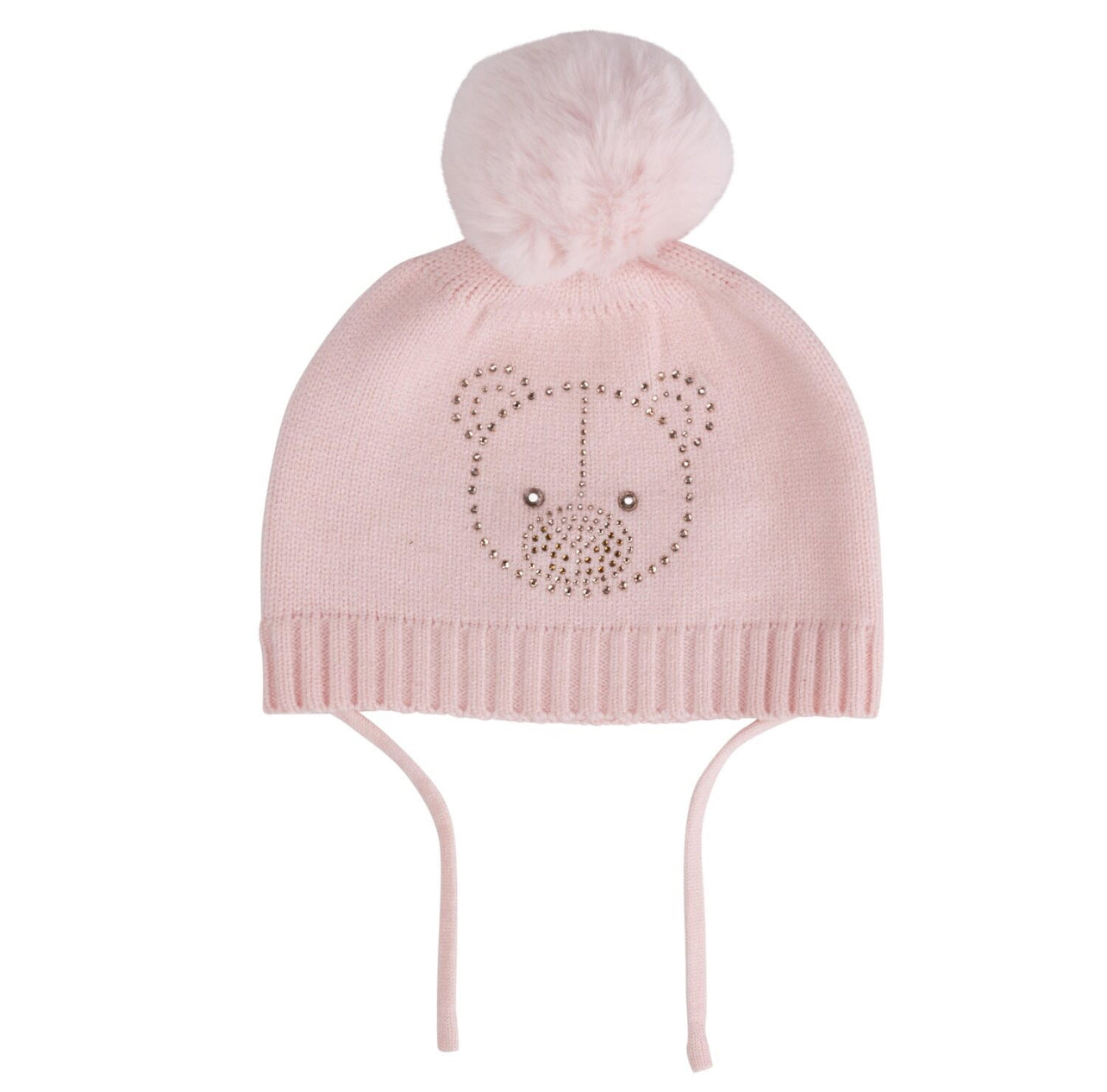 Knitted hat with detachable faux fur pom pom. Featuring diamante teddy on front and heart logo on back.