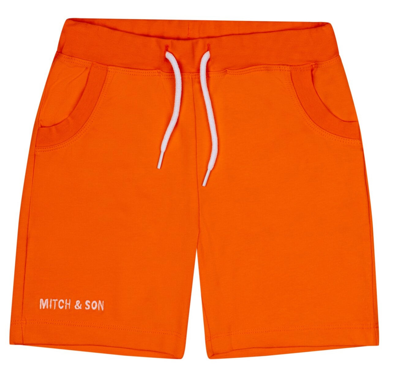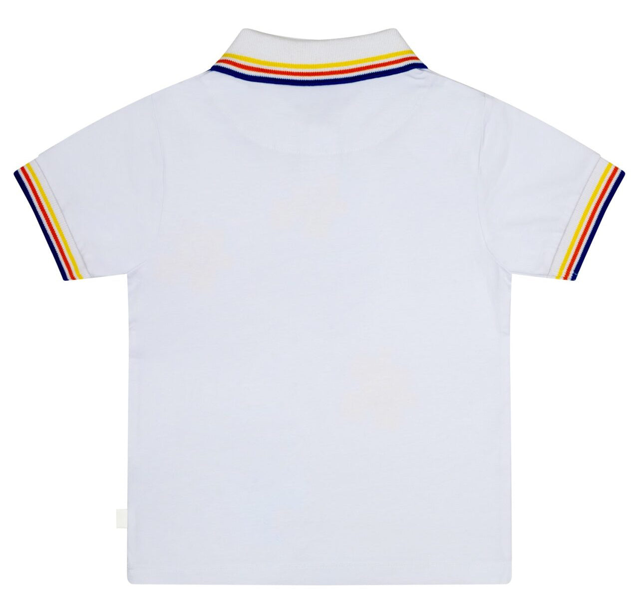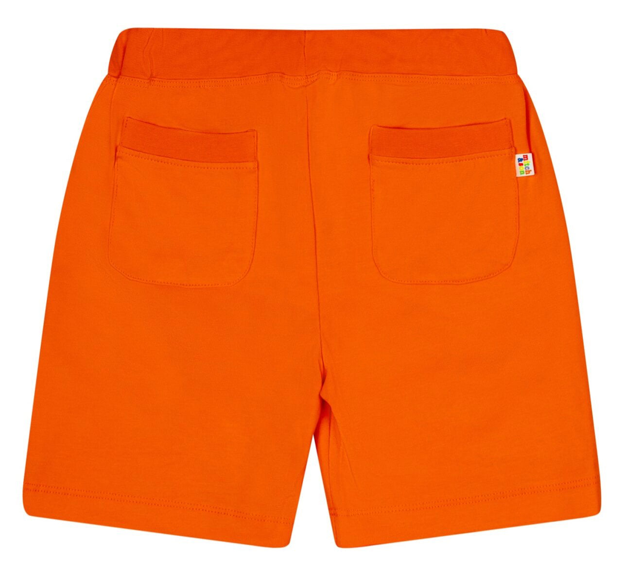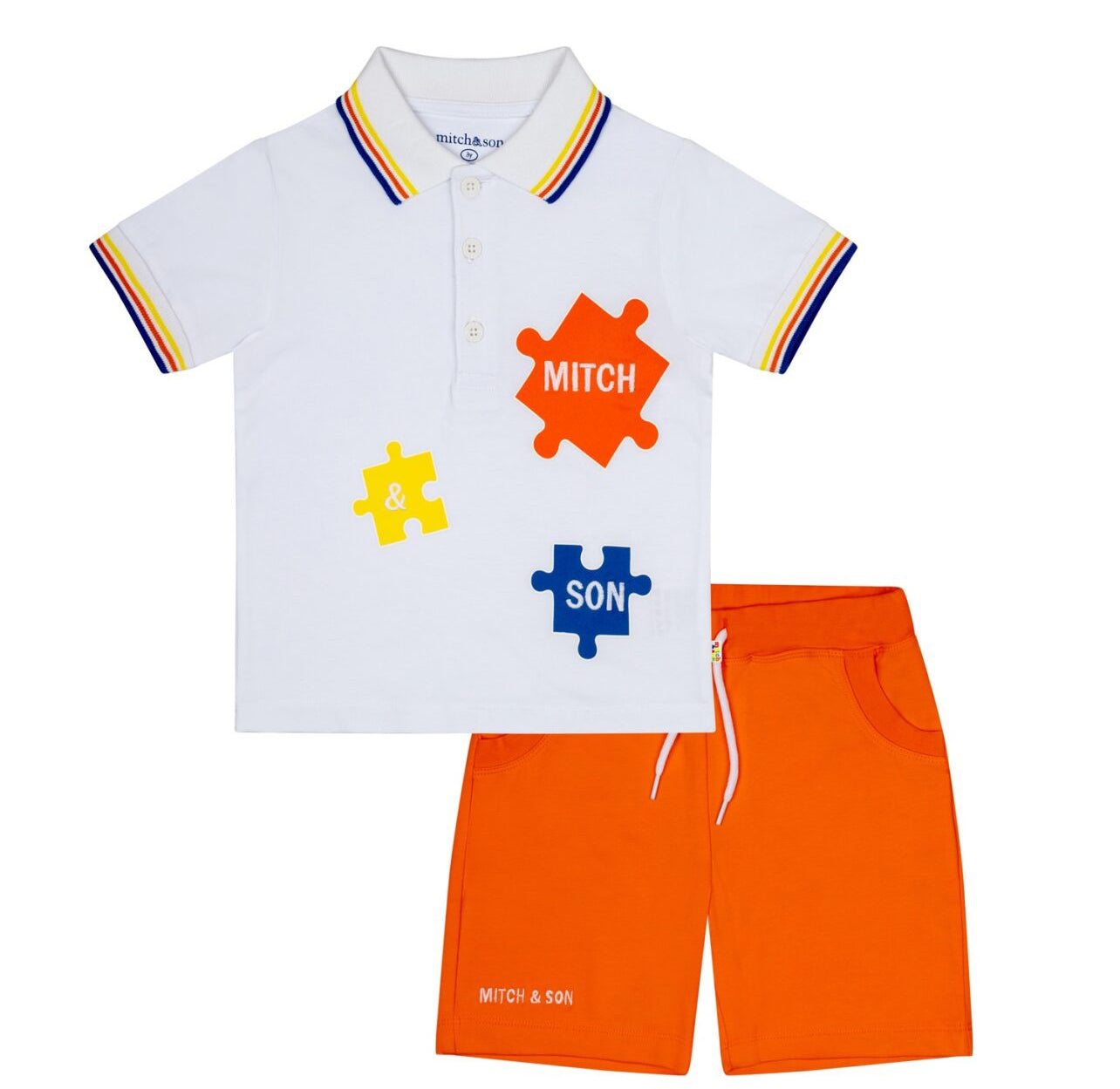 DESCRIPTION: Cotton jersey polo top with large printed and embroidered jigsaw logo art work on front featuring stripe collar and cuffs paired with orange jersey shorts with embroidered logo.