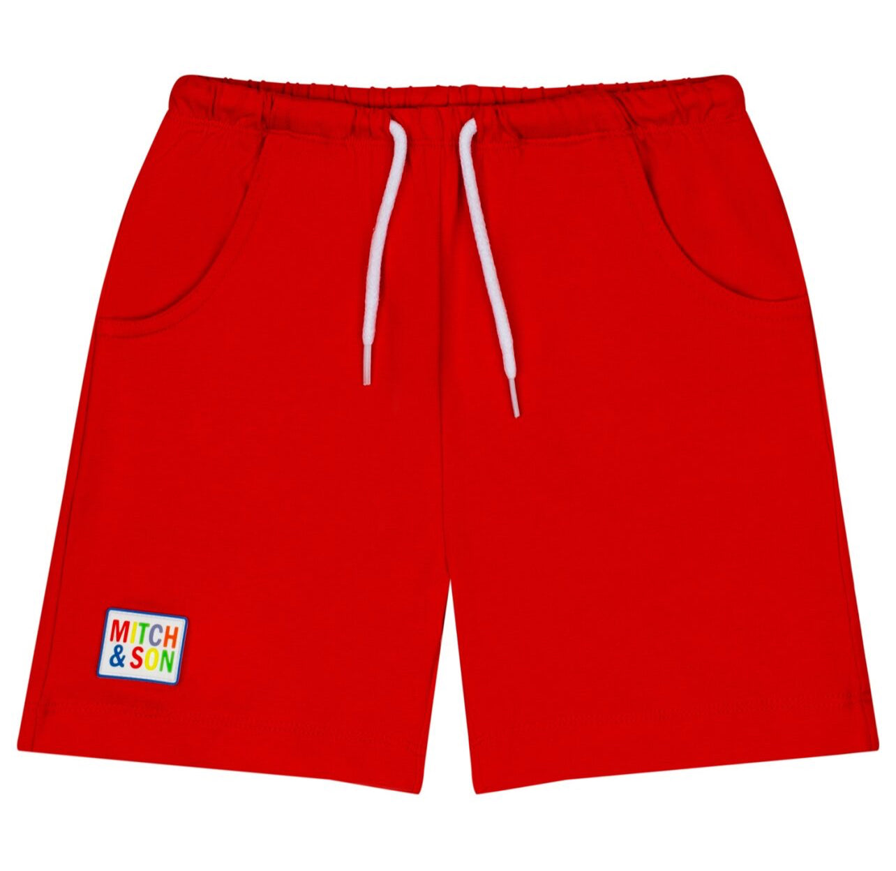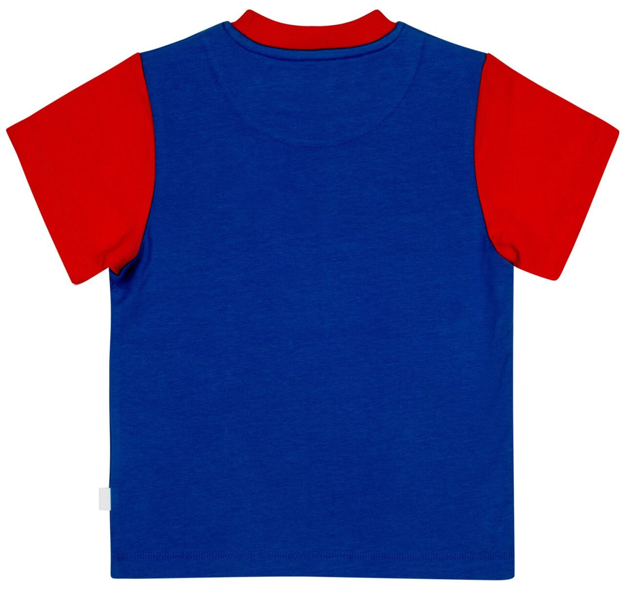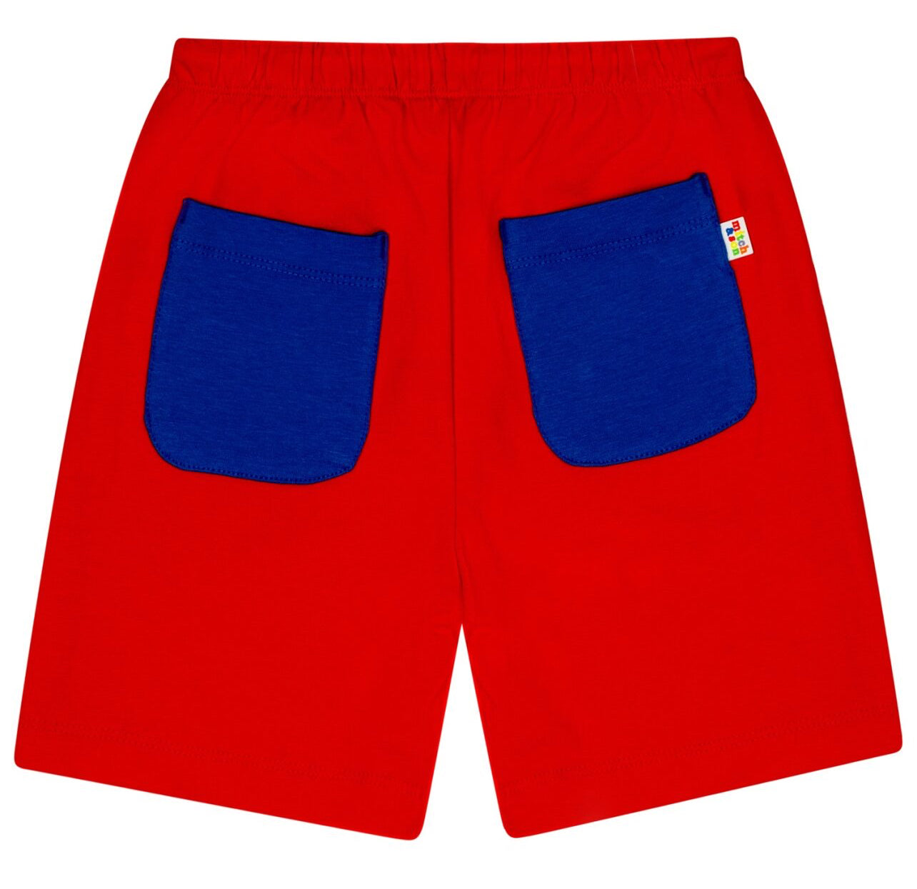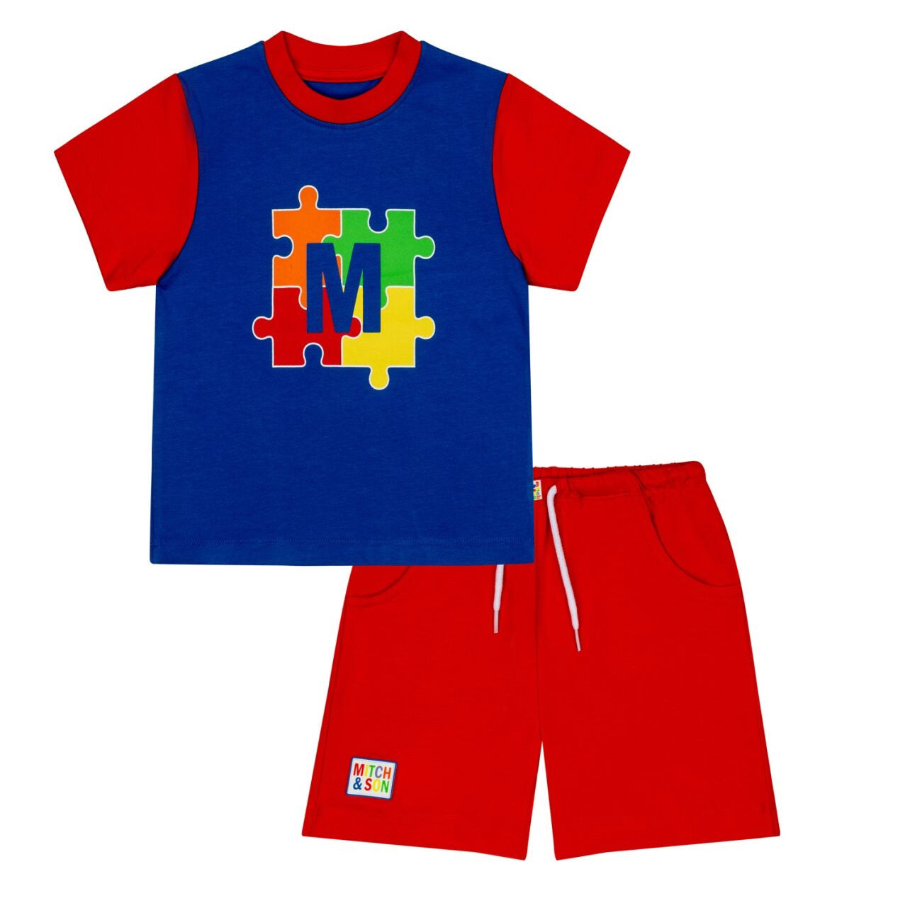 DESCRIPTION: Cotton jersey t-shirt and short set with large printed jigsaw art work on front featuring contrast red collar and sleeves paired finished with rubber logo badge on shorts.