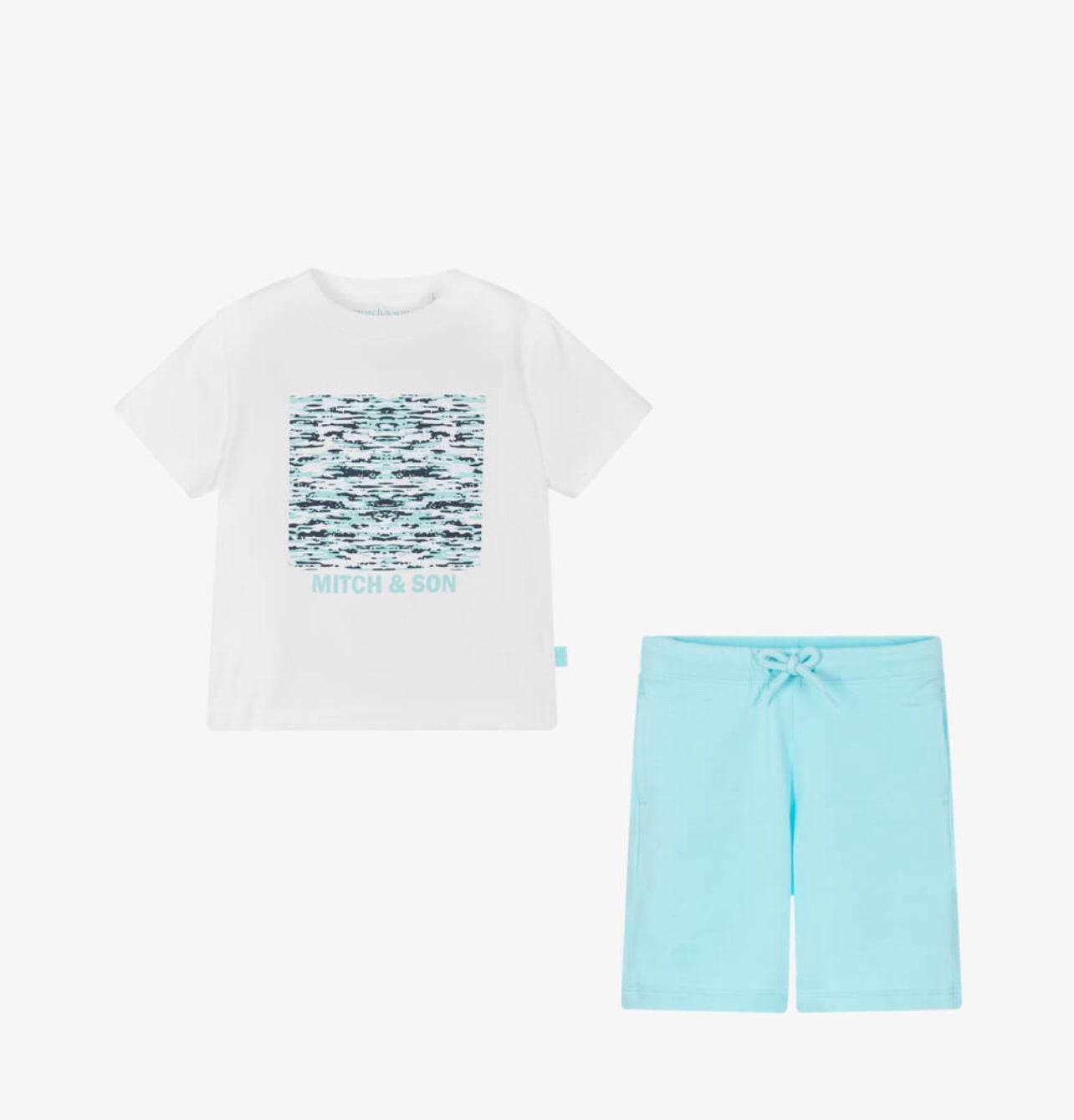 White and turquoise blue shorts set for boys by Mitch & Son, made in soft cotton jersey. The top has a blue graphic design on the front with a face hidden within the print and a blue logo printed below. The shorts have side seam and back pockets and a useful drawsting waist for a comfortable fit.