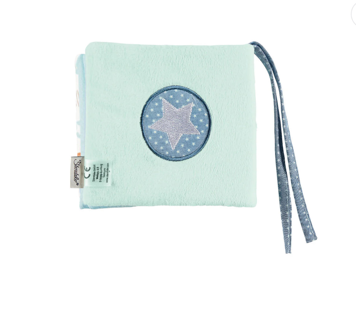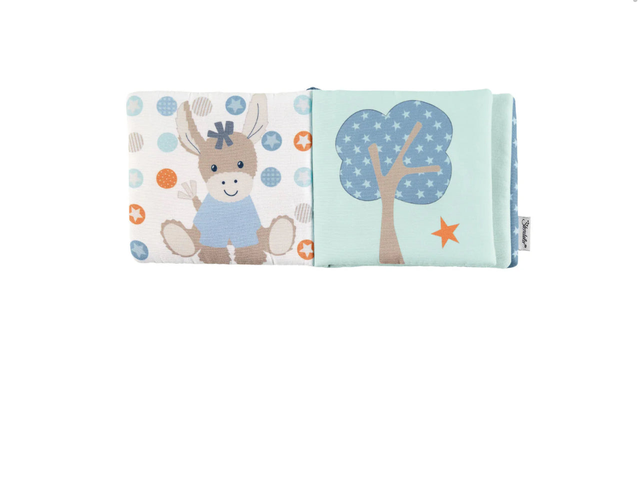 The soft playbook with the motif donkey Emmi in blue and gray made of soft velour and polycotton is particularly easy to grip for small children's hands and the 8 extra thick pages can be easily flipped. The sweet and colorful motifs stimulate the senses of your baby and encourage them to "read" and discover. Thanks to the integrated squeak and the creaking paper, the game book is also an absolute highlight acoustically.